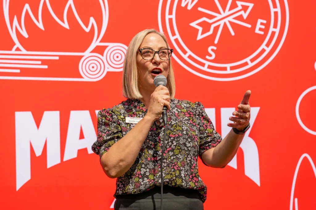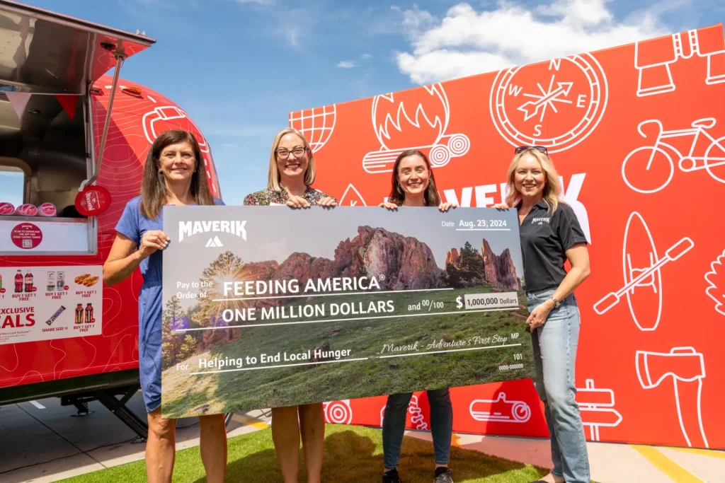 During a recent store celebration in Denver, Maverik honored its significant acquisition and rebranding milestones with a $1 million donation check presentation to Feeding America®. Maverik’s new CEO and Chief Adventure Guide, Crystal Maggelet, was joined by Feeding America Sr. Vice President of Corporate Partnerships, Lauren Biedron, and Food Bank of the Rockies Chief Development Officer, Jennifer Lackey, for the check presentation and remarks.